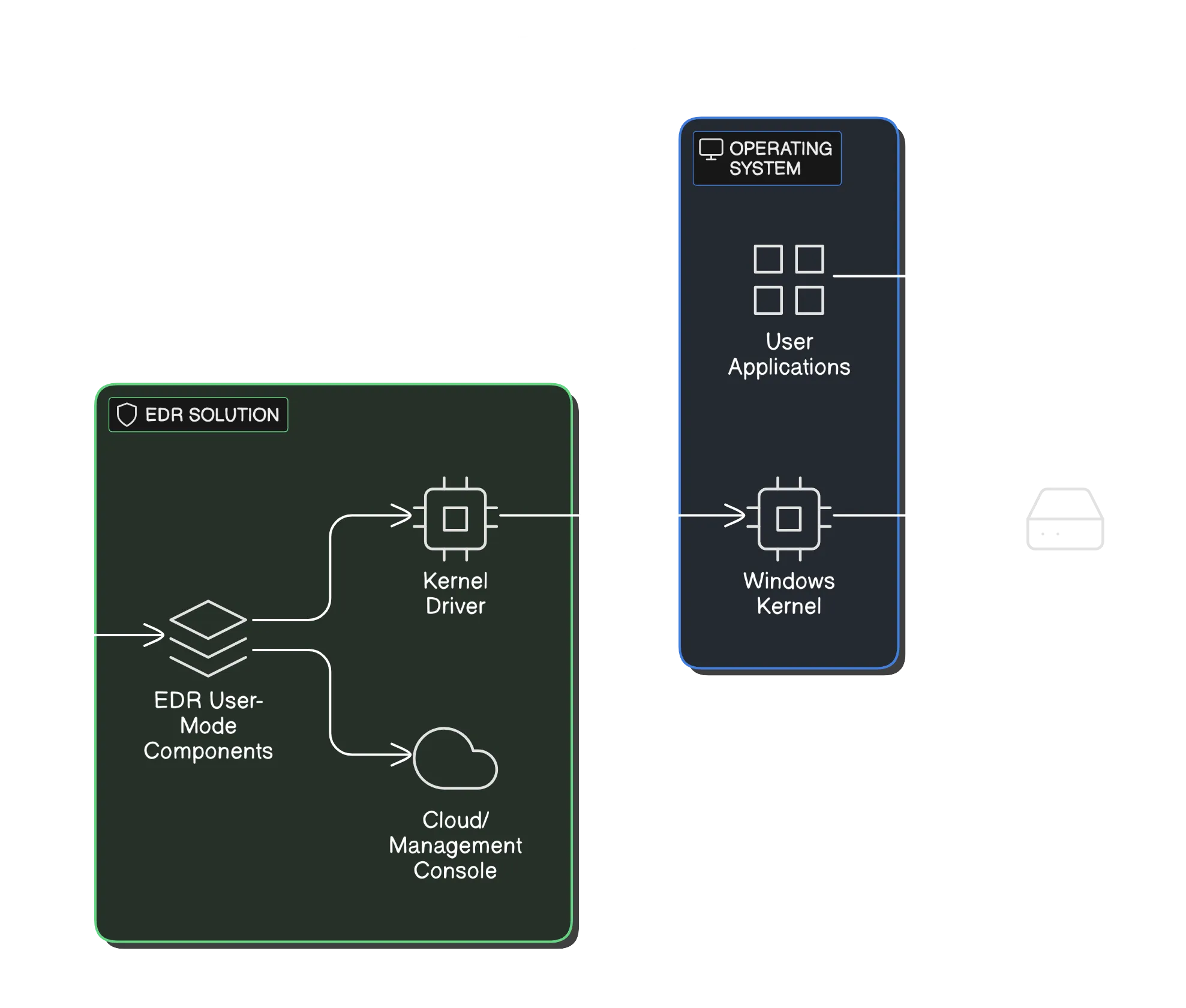 Les solutions EDR modernes emploient une architecture multicouche qui combine des composants en mode utilisateur et en mode noyau pour atteindre une visibilité et une protection complètes. L’architecture consiste typiquement en un pilote kernel pour la surveillance de bas niveau, des services en mode utilisateur pour l’analyse, et des composants cloud pour le partage de renseignements et les mises à jour.