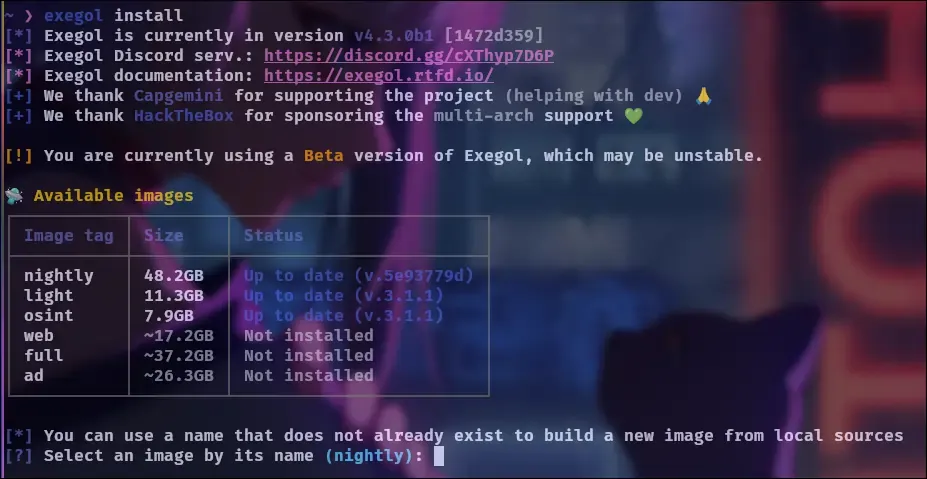 exegol installIt will ask you for the name of the image you want to install as the table shows.